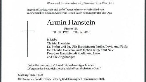 Am 9. Juli 2023 ist Pfarrer i.R. Armin Hanstein im Alter von 88 Jahren in Marburg verstorben. Armin Hanstein war von 1972 bis zu seiner Ruhestandsversetzung in 1997 erster Inhaber der Pfarrstelle Herbornseelbach. Auf seine ganz eigene Art und Weise hat er unsere Gemeinde gestaltet und in die Leben vieler Menschen hineingewirkt.
