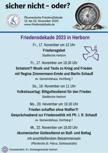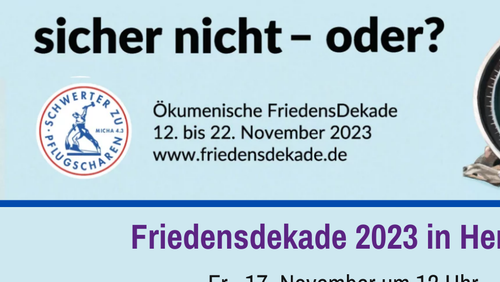 Seit über 40 Jahren engagiert sich die Ökumenische FriedensDekade für Gerechtigkeit, Frieden und die Bewahrung der Schöpfung. Auch im Jahr 2023 will die FriedensDekade einen Beitrag zur Vertiefung des christlichen Friedenszeugnisses leisten und zur friedenspolitischen Willensbildung in Kirchen, Gemeinden und Gesellschaft beitragen.