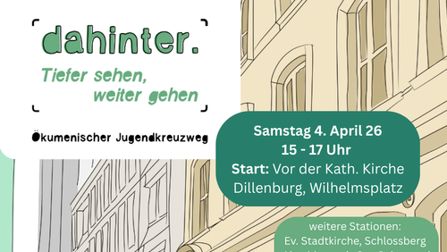 Am 04. April (Karsamstag) geht es um 15 Uhr auf dem Vorplatz der Katholischen Kirche in Dillenburg (am Wilhlemsplatz) los. Von dort geht es gemeinsam auf den Weg zur Evangelischen Stadtkirche und über den Schlossberg, wo an 5 Stationen der Leidensweg Jesu und unsere eigenen Erfahrungen in den Blick kommen.