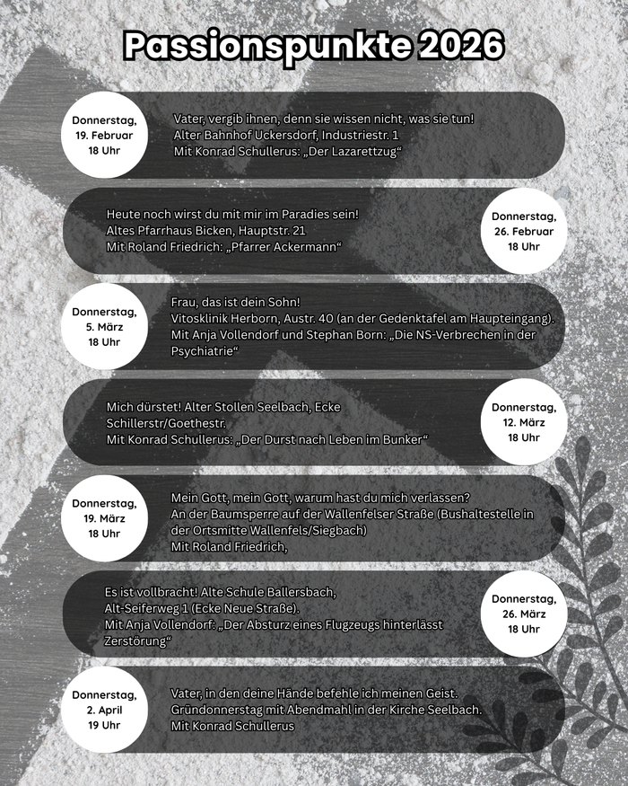 Leitmotiv für unsere Passionspunkte 2026 sind die sieben Worte am Kreuz Jesu. Wir gehen an unterschiedliche Orte in unserer Gesamtkirchengemeinde, die keine Kirchen sind. Es sind Schmerzpunkte in der Landschaft, die Spuren hinterlassen haben im Gedächtnis der Menschen. Lasst sie uns gemeinsam in den Blick nehmen und uns daran erinnern, was an Schmerz war und was uns Hoffnung machen kann!